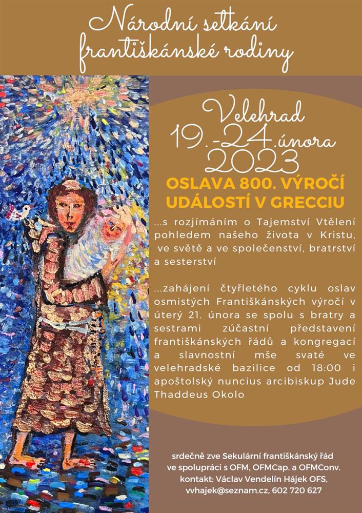 Národní setkání františkánské rodiny bude probíhat od 19. do 24. února 2023 na Velehradě. Nebude to setkání nahodilé, bude mít své krásné motto; Vtělení živého Boha – skutečné Tajemství, nad kterým nelze přestat žasnout. Nahlížet na něj budeme pohledem našeho života v Kristu, života ve světě i ve společenství, pohledem bratrství a sesterství. Oslavme tak tento dar spolu s bratry a sestrami všech řádů a kongregací celé naší františkánské rodiny. Spolu za něj děkujme, spolu nad ním žasněme.
