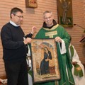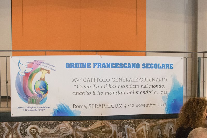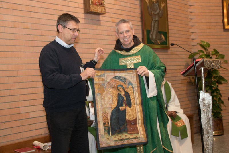 Gen. Ministr OFM P. Michael Anthony Perry předává dar Sekulárnímu františkánskému řádu do rukou Gen. Ministra OFS br. Tibora Kausera – gobelín „Zvěstování Panny Marii“